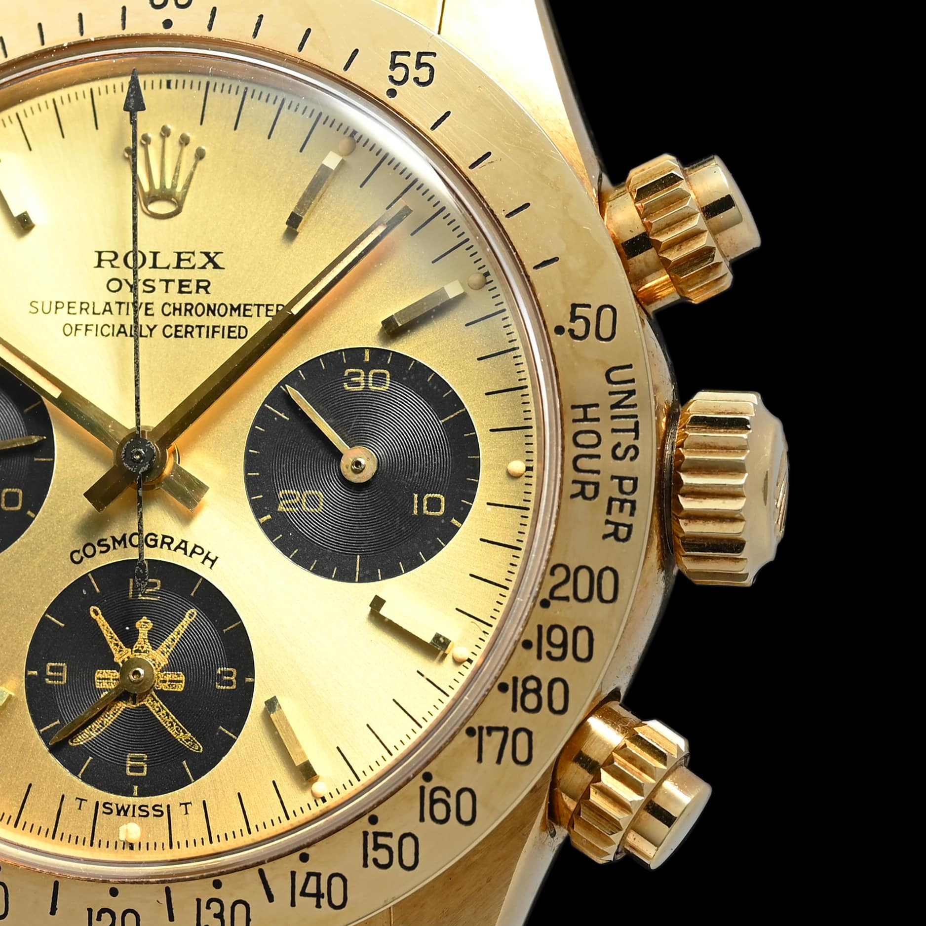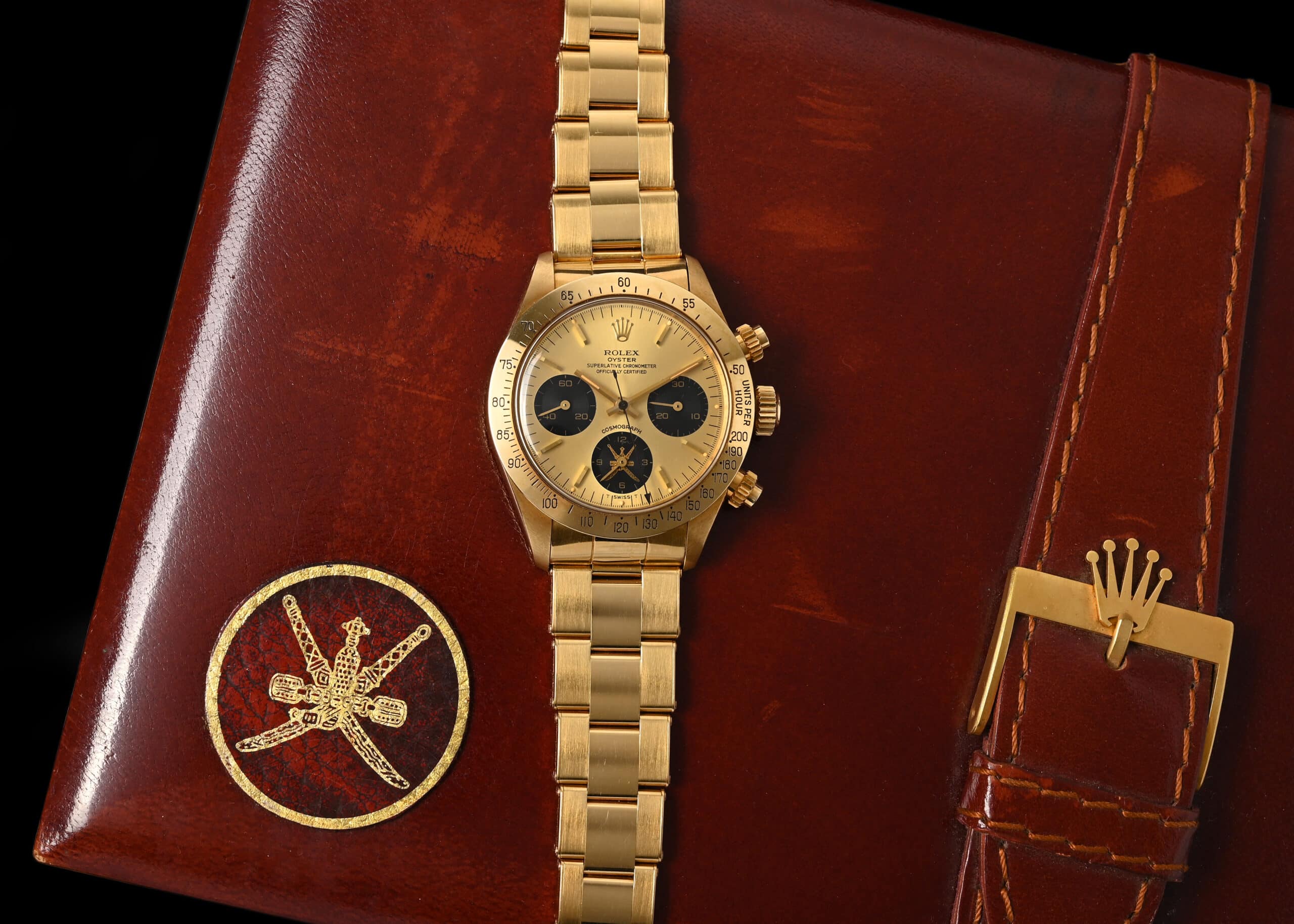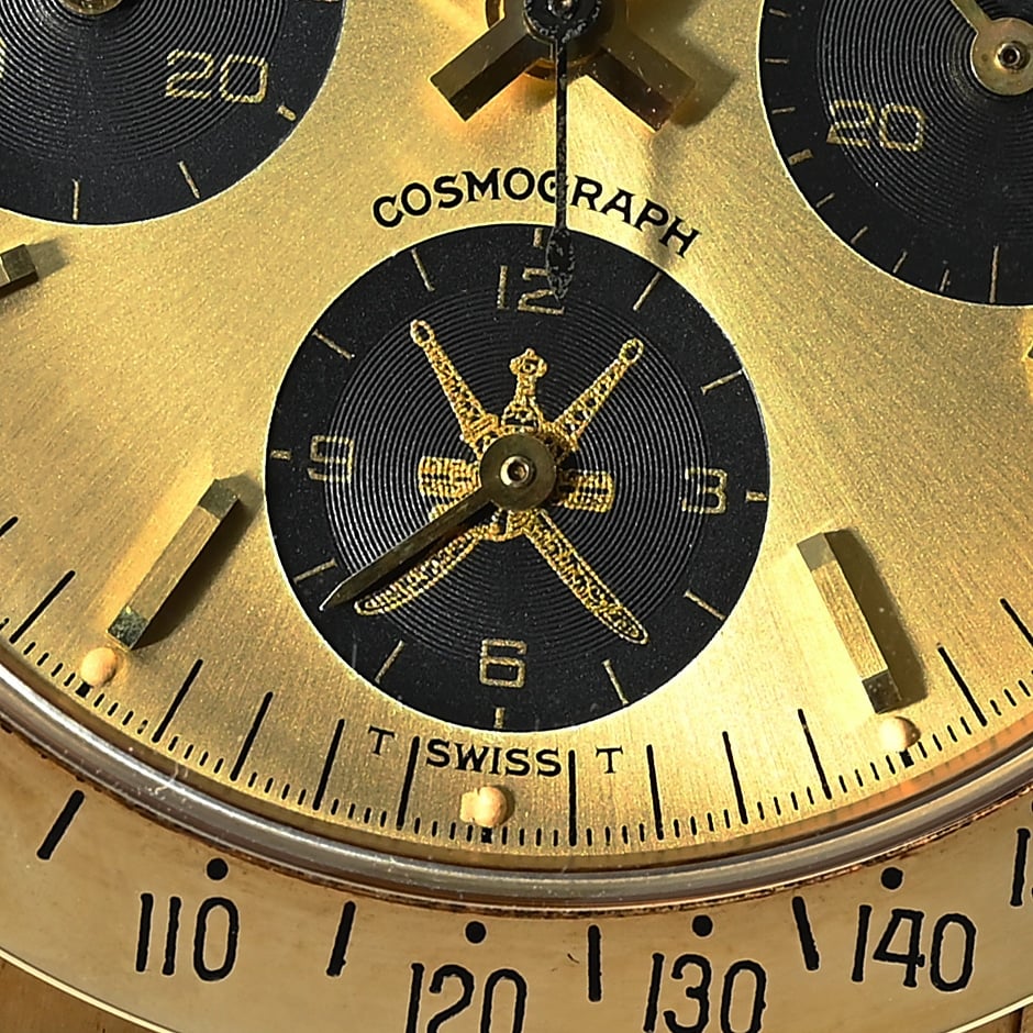 Durante gli anni ’70, Sua Maestà Qaboos bin Said Al Said, commissionò a Rolex la produzione di un certo numero di orologi spesso decorati con il logo Khanjar, o la firma di Sua Altezza alle 6 o alle 9. Questi modelli su ordinazione speciale andavano dal Submariner, al Daytona e persino al Day-Date. Gli orologi dotati di quadranti “Khanjar” venivano presentati in dono ai più stretti dignitari e funzionari del monarca. È stato un onore e un segno di rispetto ricevere un orologio Rolex raffigurante il simbolo dello stato dell’Oman. Molti di questi orologi sono amati dai proprietari originali, raramente indossati e tramandati di generazione in generazione. Il 6265 in foto presenta il logo Khanjar alle 6, all’interno del contatore delle ore cronografiche. Stampato nei toni dell’oro, si abbina incredibilmente bene alla grafica dorata. L’orologio stesso è conservato in ottime condizioni, con segni distintivi nitidi e segni d’oro sotto le anse. È ancora dotato dei suoi pulsanti e bracciale originali, che conserva le sue 71 maglie finali. Ancora più rara è la presenza dell’adesivo di fabbrica sul fondello. Si può supporre che l’orologio sia stato indossato solo una manciata di volte.
