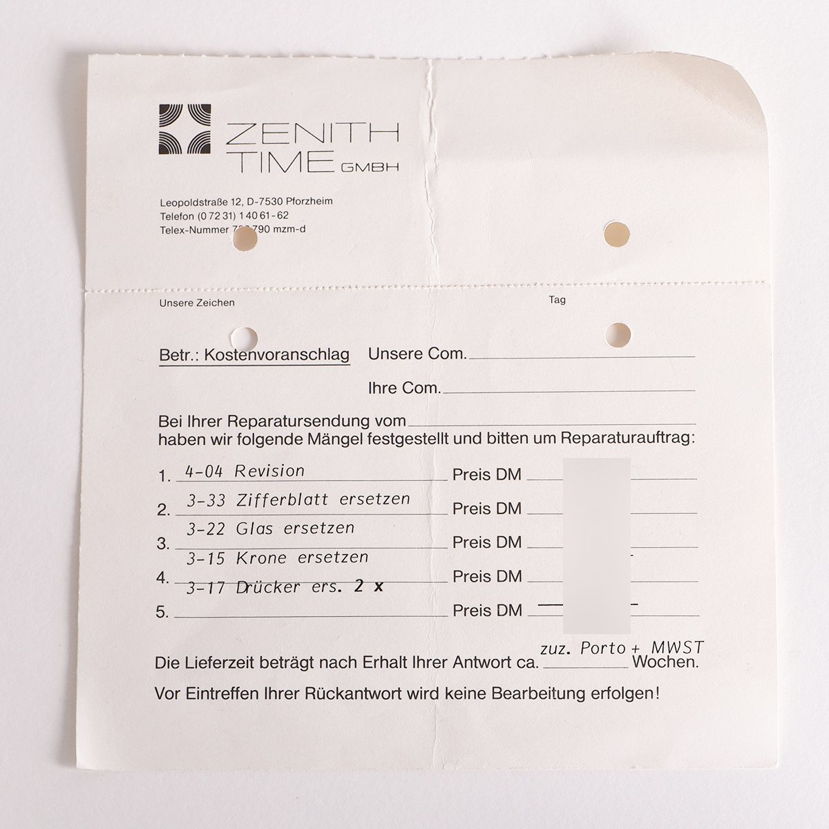 Zenith El-Primero Chronograph A386 , SERVICE ZENITH 1986